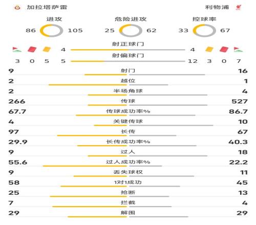 在傳球數(shù)上,利物浦以527-266明顯高出對手;在傳球成功率方面,利物浦則以86.7%-67.7%占據(jù)著明顯優(yōu)勢,其中在關鍵傳球的數(shù)據(jù)上,利物浦則以10-4占優(yōu)。在過人方面,利物浦也以18-9占據(jù)優(yōu)勢,但過分成功率方面,反倒是加拉塔薩雷以55.6%-22.2%領先。