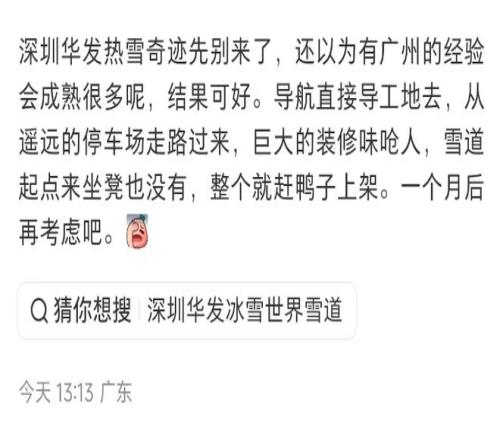 作為深圳重點項目,華發(fā)冰雪世界的進展一直吸引著市場的關(guān)注。華發(fā)股份此前曾對外宣稱該項目預計于第四季度開業(yè),市場猜測可能到11月份,而最終實際開業(yè)時間早于預期。但開業(yè)節(jié)奏的提前,也暴露除部分配套待改善的問題。