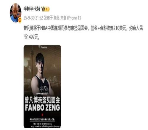 根據(jù)最新報道,曾凡博將在NBA中國賽期間舉辦親簽見面會,而參加見面會進(jìn)行簽名與合影的收費(fèi)是210美元,折合人民幣1497元。