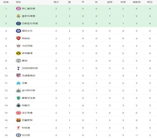 隨著巴黎21絕殺巴薩,曼城22遭絕平,歐冠最新積分榜:拜仁領跑