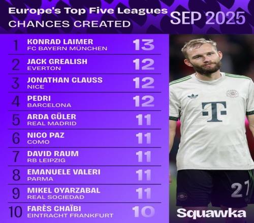 五大聯(lián)賽9月創(chuàng)造機(jī)會(huì)榜:萊默爾第1,格10、佩德里緊隨其后
