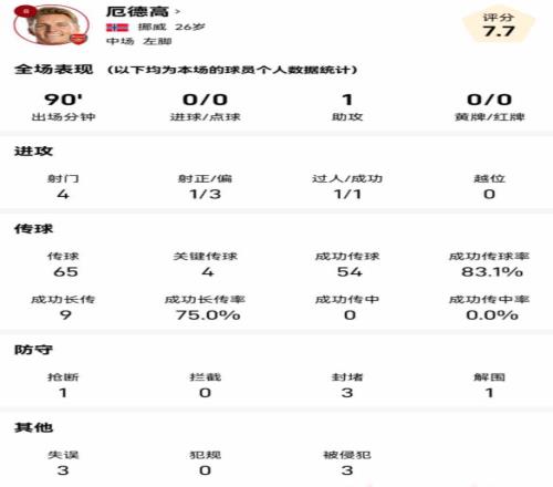 厄德高本場(chǎng)比賽貢獻(xiàn)4次射門,1次成功過(guò)人;65次傳球。4次關(guān)鍵傳球,1次助攻,傳球成功率83.1%。防守方面還貢獻(xiàn)了1次搶斷3次封堵和1次解圍。