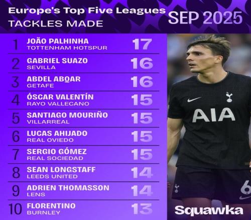 當?shù)貢r間10月1日,知名數(shù)據(jù)機構Squawka發(fā)布了五大聯(lián)賽九月份鏟球榜,熱刺中場帕利尼亞以17次鏟球位居榜首。
