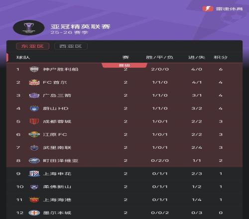 亞精英賽積分榜:成都蓉城3分暫列第5,申花第9,海港第11