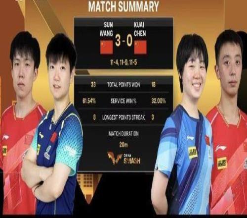 2025年WTT中國(guó)大滿貫混雙1/4決賽,王楚欽/孫穎莎以3比0(11比4、11比9、11比5)戰(zhàn)勝隊(duì)友陳垣宇/蒯曼,晉級(jí)四強(qiáng)。王楚欽/孫穎莎半決賽的對(duì)手是巴西組合雨果/高橋·布魯娜。