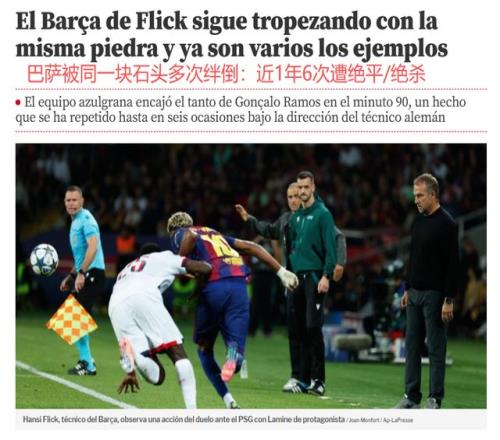 歐冠聯(lián)賽階段第2輪,巴薩主場(chǎng)1-2負(fù)于巴黎圣日耳曼,遭遇賽季首敗。10月2日,《世界體育報(bào)》指出,巴薩在第90分鐘丟球遭絕殺,這讓主帥弗里克很不滿。最近1年,巴薩已經(jīng)6次被絕平或者絕殺。