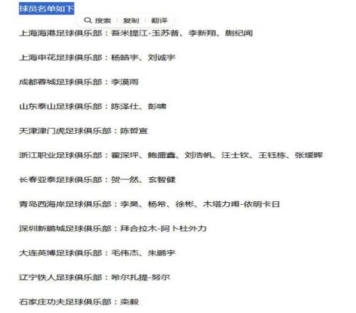 輸出兩名U22國(guó)腳的俱樂部有4家,分別為:上海申花(楊皓宇、劉誠(chéng)宇)、山東泰山(陳澤仕、彭嘯)、長(zhǎng)春亞泰(賀一然、玄智?。?、大連英博(毛偉杰、朱鵬宇)俱樂部;另外,5家俱樂部各輸出1名國(guó)腳,分別為:成都蓉城(李漠雨)、天津津門虎(陳哲宣)、深圳新鵬城(拜合拉木)、遼寧鐵人(希爾扎提-努爾)、石家莊功夫(欒毅)。