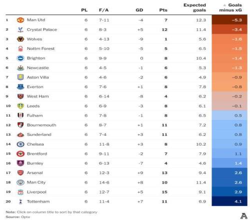英超開季6輪,曼聯(lián)又來到了和上賽季相似的積分榜倒數(shù)位置,阿莫林下課聲此起彼伏。不過,日前競(jìng)技網(wǎng)的一番數(shù)據(jù)分析顯示,曼聯(lián)可能并沒有積分顯示得那么糟糕,阿莫林所說的“比賽結(jié)果沒有反映出球隊(duì)表現(xiàn)”也許不是完全沒有道理。至少,在“預(yù)期進(jìn)球”(xG)這項(xiàng)數(shù)據(jù)上,曼聯(lián)其實(shí)是英超第一!