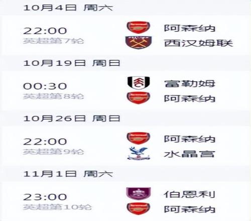 阿森納將先后在主場迎戰(zhàn)西漢姆聯(lián),隨后客場對陣富勒姆,之后回到主場對陣水晶宮,再連續(xù)客場挑戰(zhàn)兩支升班馬伯恩利與桑德蘭。