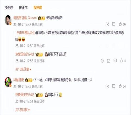 國安官微下也遭到了自己家球迷的反戈一擊,兩大國安著名球迷均發(fā)表了言論,“清蒸樹袋熊”打了一串哈哈哈哈哈哈來發(fā)泄情緒,“鳳凰魚肥”則表示下一場,如果教練席需要狗的話,我可以捐贈(zèng)一只。