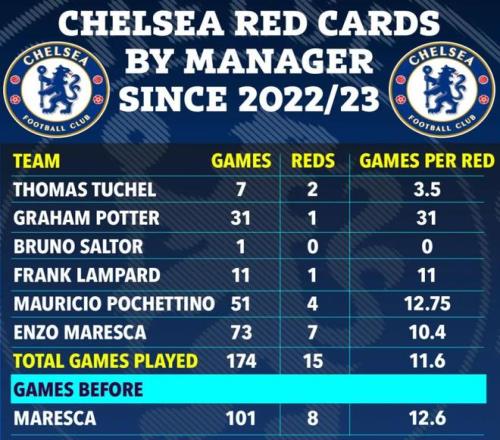 這一數(shù)據(jù)甚至比2022年切爾西現(xiàn)任管理層接手后球隊的整體紅牌率(每11.6場1張)還要糟糕,也比馬雷斯卡上任前球隊“每12.6場1張紅牌”的表現(xiàn)進(jìn)一步惡化。
