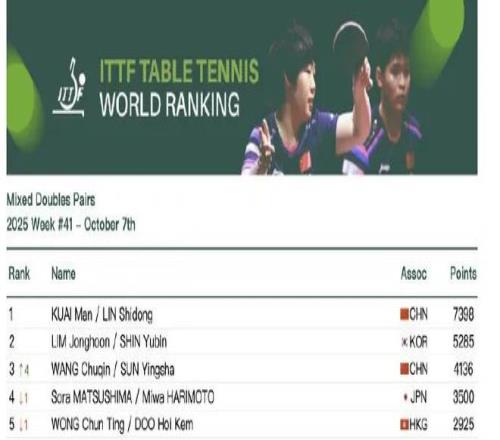 據(jù)央視新聞10月7日消息,今天,國際乒聯(lián)公布2025年第41周世界排名。