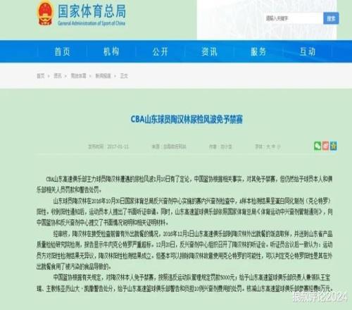 CBA山東高速俱樂部主力球員遭遇的尿檢風(fēng)波1月10日有了定論,中國籃協(xié)根據(jù)相關(guān)事實(shí),對其免予禁賽,但仍然給予球員本人和俱樂部相關(guān)人員罰款和警告處罰。