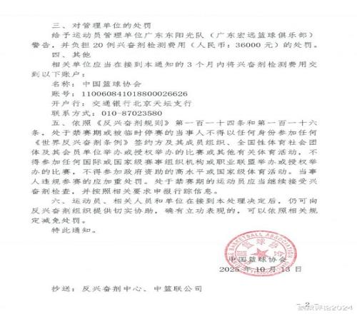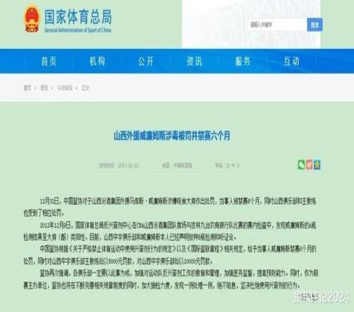 中國籃協(xié)根據(jù)《關(guān)于嚴(yán)格禁止體育運(yùn)動中使用興奮劑行為的規(guī)定》以及《國際籃聯(lián)章程》相關(guān)規(guī)定,給予當(dāng)事人威廉姆斯禁賽6個(gè)月的處罰,同時(shí)對山西中宇俱樂部主教練處以5000元罰款,對山西中宇俱樂部處以10000元罰款。