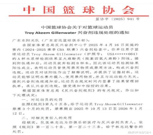 在國家體育總局反興奮劑中心于2025年4月16日實(shí)施的賽內(nèi)興奮劑檢查中,你單位男子籃球運(yùn)動員吉倫沃特的A樣本尿樣檢測結(jié)果呈大麻酚類(羧基四氫大麻酚)陽性。