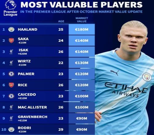 不過利物浦的這四個球員都不是最高身價,英超第一身價是來自曼城的超級神鋒哈蘭德,本賽季英超聯(lián)賽開賽以來,哈蘭德在7場比賽打進9粒進球,他的全面性無人能及,即便是姆巴佩在門前的沖擊力也無法和哈蘭德媲美。