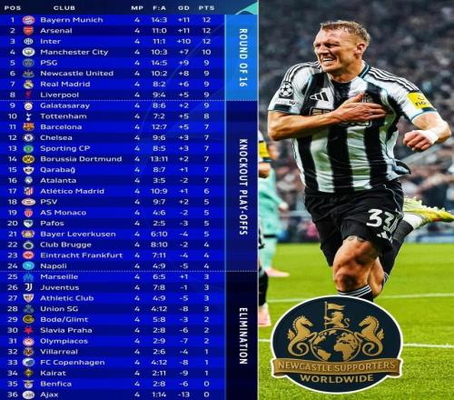 歐冠聯(lián)賽階段第4輪,紐卡主場(chǎng)2比0畢爾巴鄂,丹·伯恩首開紀(jì)錄,若埃林通鎖定勝局,托納利當(dāng)選MVP。喜鵲3勝1負(fù)排名第6,與巴黎、利物浦、皇馬同分。 本季歐冠英超球隊(duì)8次出戰(zhàn)西甲球隊(duì),以7勝1負(fù)占?jí)旱剐詢?yōu)勢(shì)。紐卡的勝利宣告英超6支歐冠參賽隊(duì)本輪5勝1平的強(qiáng)勢(shì)。在前4輪24場(chǎng)比賽中,英超球隊(duì)17勝4平3負(fù),在前4、前8、前10、前12均占半壁江山。其中阿森納(4勝)、曼城(3勝1平)、熱刺(2勝2平)保持不敗。阿森納進(jìn)11球失0球,與拜仁并列榜首,下輪兩隊(duì)將直接對(duì)話。