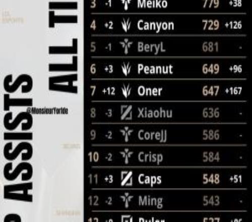 電競體育11月6報道?今日外媒統(tǒng)計全球總決賽最新助攻榜,從數(shù)據(jù)來看,F(xiàn)aker、Keria選手有望在11月9日的決賽達成破千成就,而Keria選手也有望超越Faker選手來到助攻榜第一的位置。