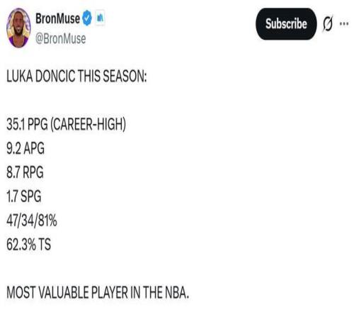 面對東契奇這樣的表現(xiàn),湖人媒體BronMuse也曬出數(shù)據(jù)點評道:“聯(lián)盟最有價值球員?!?/p>