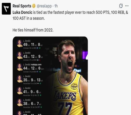 第八項:東契奇開季15場拿到至少500分100助攻100籃板追平22年的自己并列歷史最快;