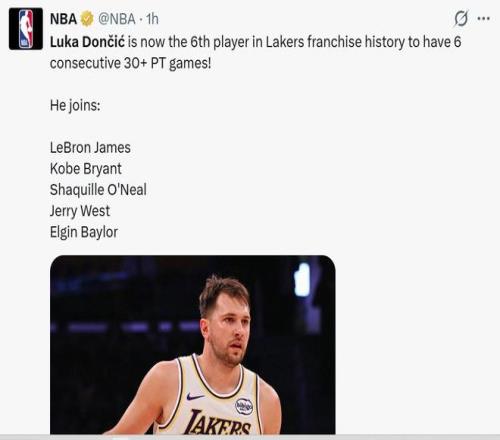 第九項:東契奇連續(xù)6場砍下30+,成為湖人隊史第六人,前五人分別是詹姆斯、科比、奧尼爾、韋斯特和埃爾金-貝勒。