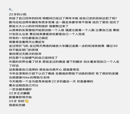 上馬比賽日,是阮世穎23歲的生日。今年上馬,也是這個從云南文山市丘北縣雙龍營鎮(zhèn)上來的小姑娘的人生首馬。比賽日早晨5點(diǎn)醒來后,阮世穎給自己寫下了一段“生日獨(dú)白”。寫完發(fā)在朋友圈,準(zhǔn)備出發(fā)時,阮世穎對著酒店房間內(nèi)的鏡子大聲對自己說了兩句話——我可以的,加油,我行的。