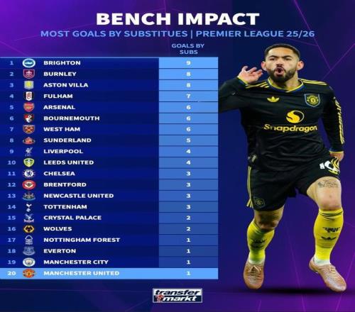 在馬特烏斯-庫尼亞對陣阿森納打入制勝球之前,曼聯(lián)是本賽季英超唯一一支替補(bǔ)球員沒有進(jìn)球的球隊(duì)。