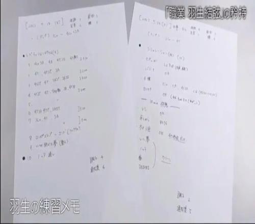 日本電視臺(tái)曾跟拍羽生結(jié)弦的訓(xùn)練和生活,制作了一部紀(jì)錄片《“職業(yè)羽生結(jié)弦”的自尊》。羽生結(jié)弦每天比較固定的是冰上訓(xùn)練3.5小時(shí),陸地訓(xùn)練1.5小時(shí)。此外他有一本詳細(xì)的訓(xùn)練日志,記錄每天訓(xùn)練的具體內(nèi)容,比如在一周兩次的爆發(fā)力訓(xùn)練中,他要進(jìn)行7組由四周跳和三周跳構(gòu)成的訓(xùn)練。訓(xùn)練結(jié)束后,他還要給身體、疲勞、腳踝、腰的狀態(tài)及整體完成度打分。