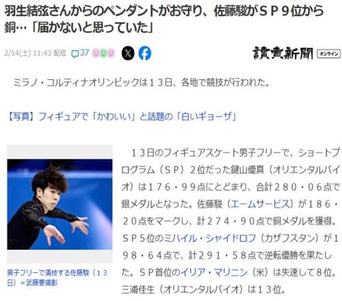 佐藤駿跟羽生結(jié)弦一樣是仙臺人,他小時候就是因為崇拜羽生結(jié)弦才進入的花滑世界。賽后他表示從羽生前輩那里得到的吊墜代替了護身符陪伴在身邊,在前幾天短節(jié)目失誤后也是看著前輩的傳奇表演“晴明”受到鼓舞才拿下的這枚銅牌。