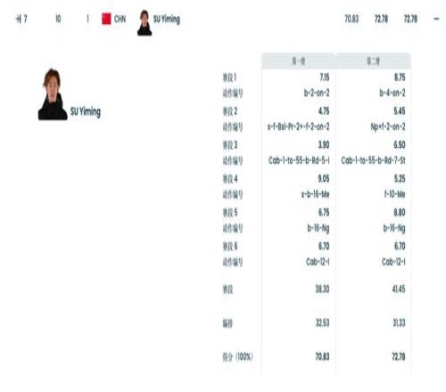 在第一輪比賽中,第10位出發(fā)的蘇翊鳴獲得了70.83分,排在第6名。第二滑蘇翊鳴的表現(xiàn)更為出色,不過由于第四個動作選擇了難度較低的正身1080 Melon抓板,單個動作僅收獲5.25,最終第二滑獲得了72.78分。
